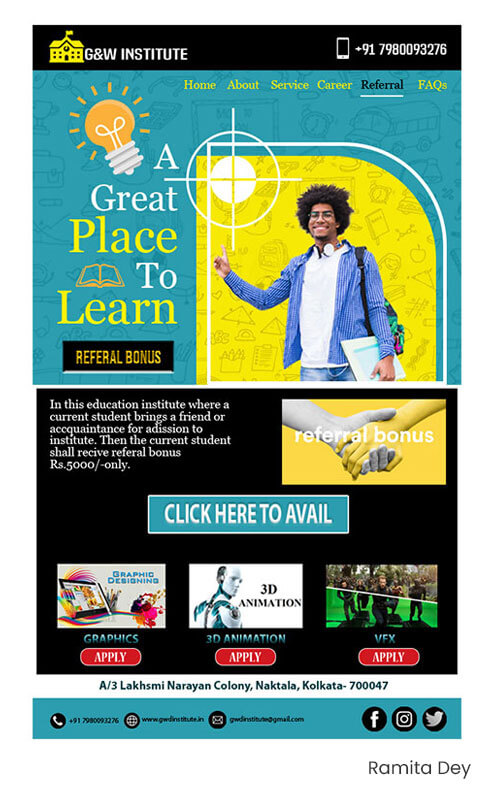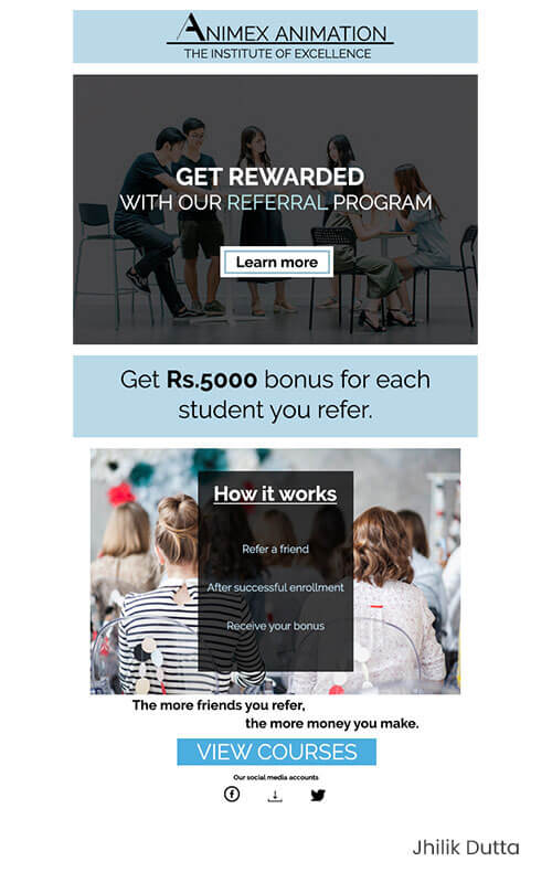 Create an emailer for an Educational Institute wherein if a current student brings a friend / or acquaintance for admission to the institute. Then the current student shall receive referral bonus of Rs.5000/- only, provided there is a successful enrollment of the new student.