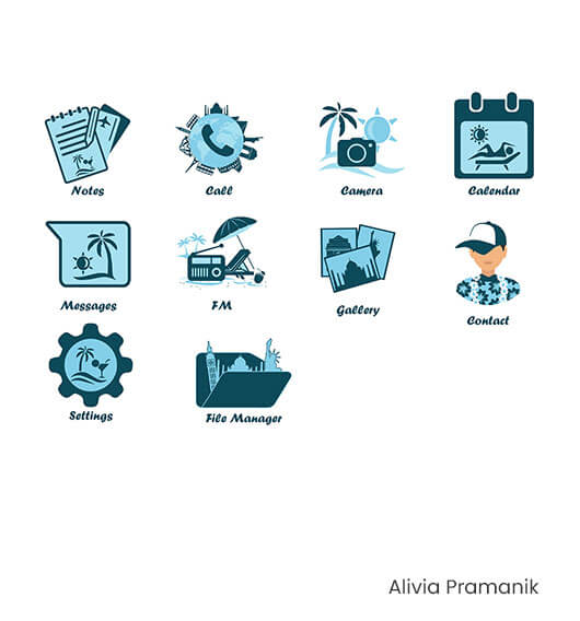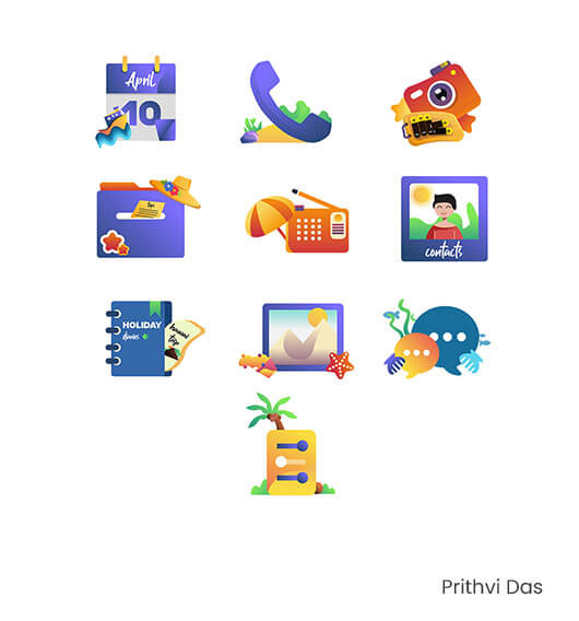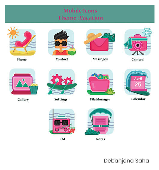 Use your creative thought to design a creative icon sot based on the following theme Vacation. The icon it should contain the following items Call, Contact Messages, Settings, FM Camera, Calendar, Notes, File Manager, Gallery.