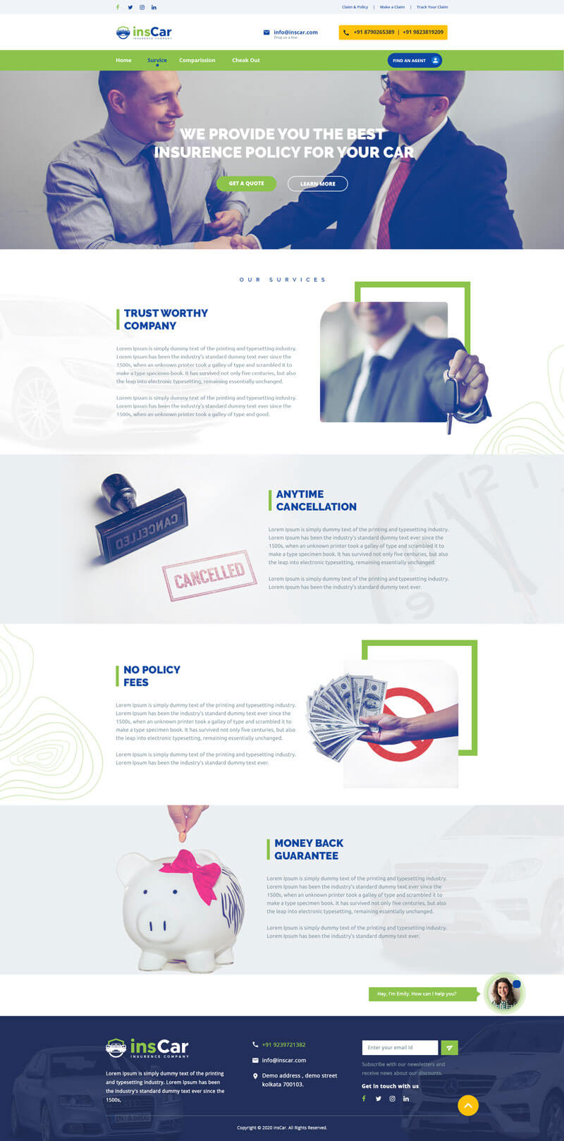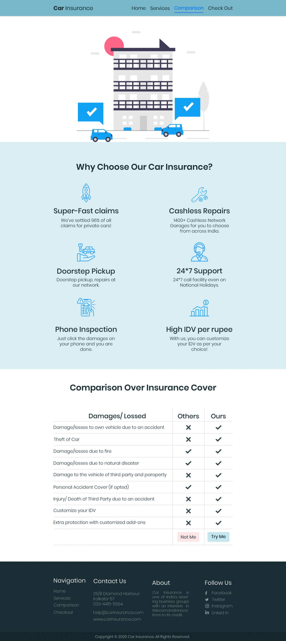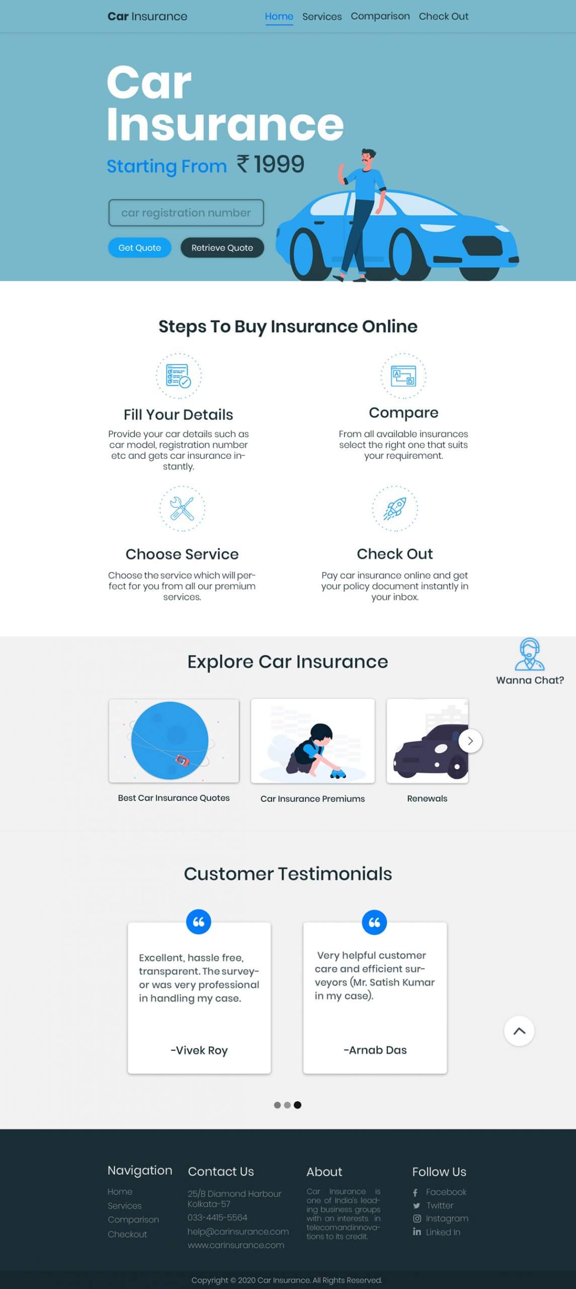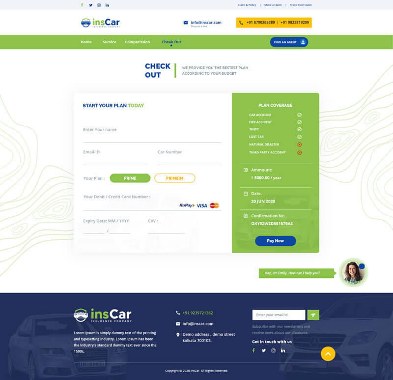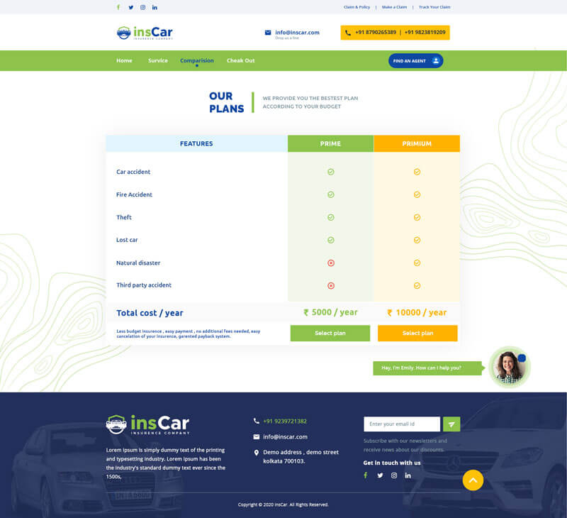 Create a mockup for insurance company providing car insurance through online. Your mockup must include Home page, Services page, Comparison with other insurance companies page, Check out page. Separately include an online chat option for the viewers/ visitors
