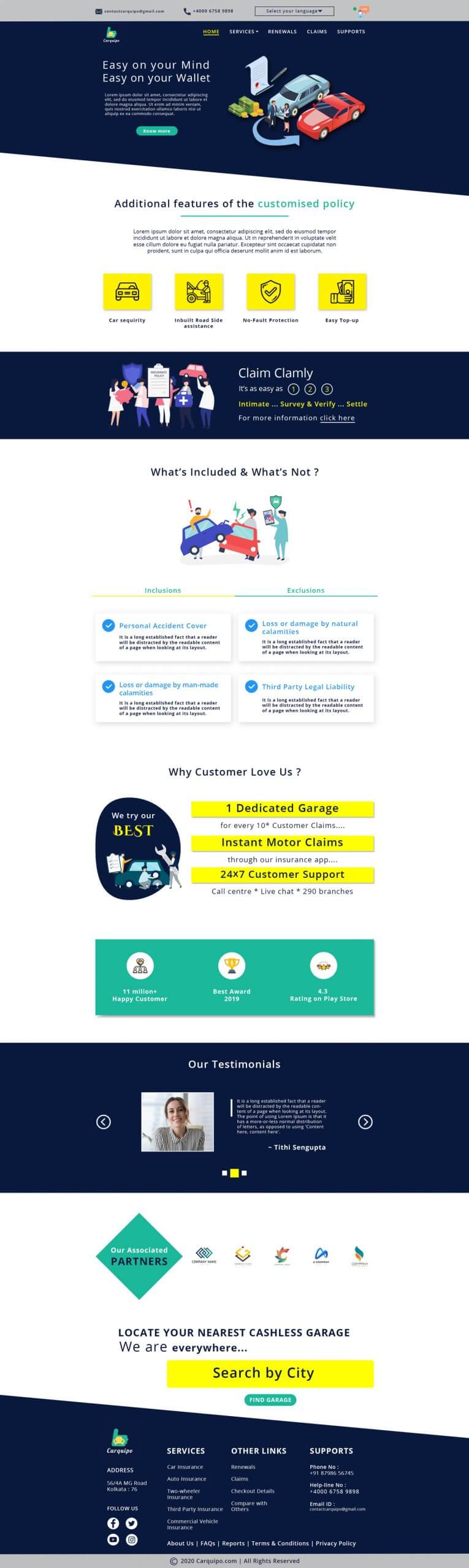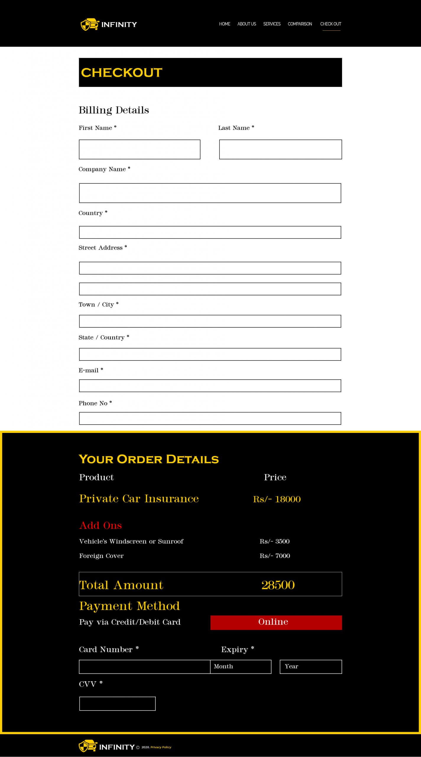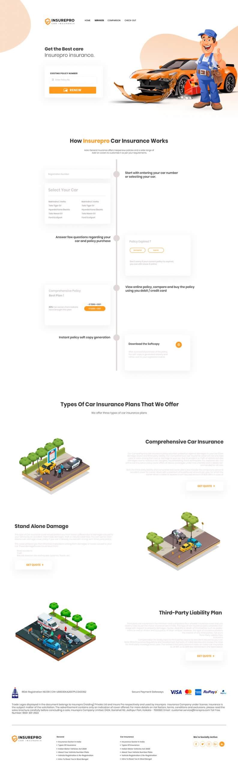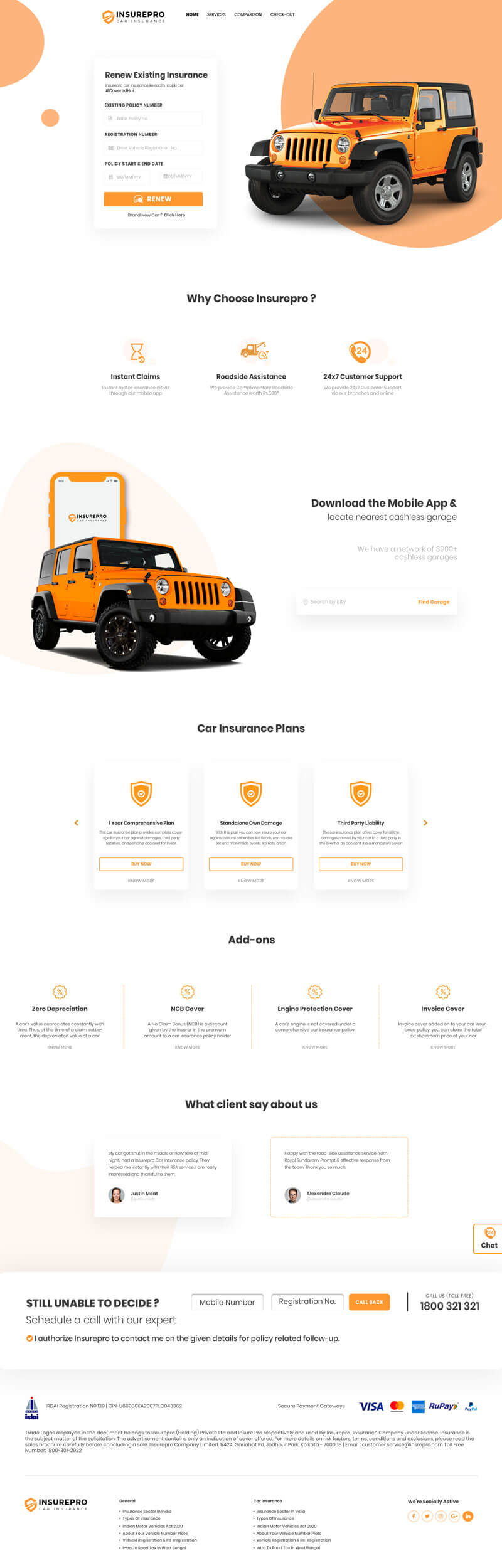 Create a mockup for insurance company providing car insurance through online. Your mockup must include Home page, Services page, Comparison with other insurance companies page, Check out page. Separately include an online chat option for the viewers/ visitors