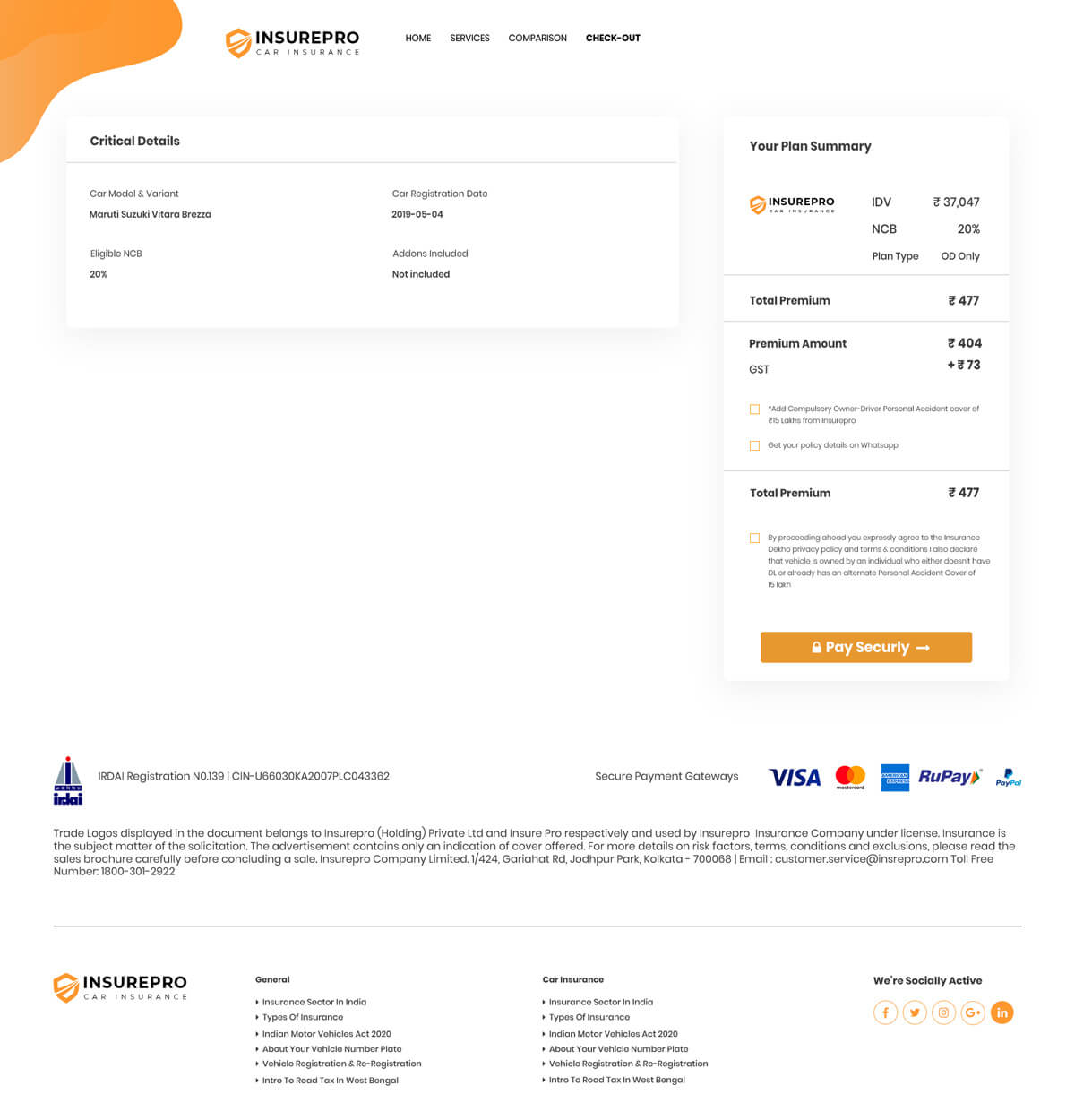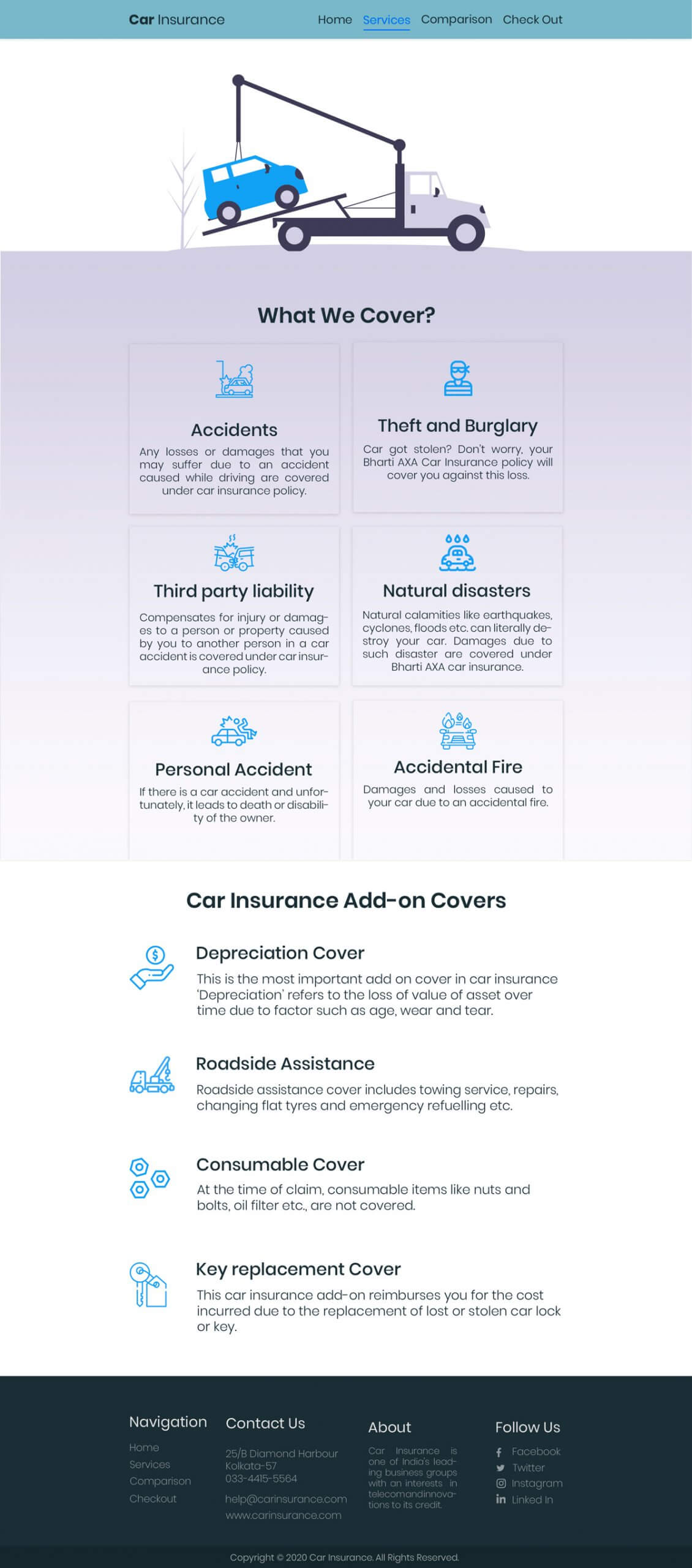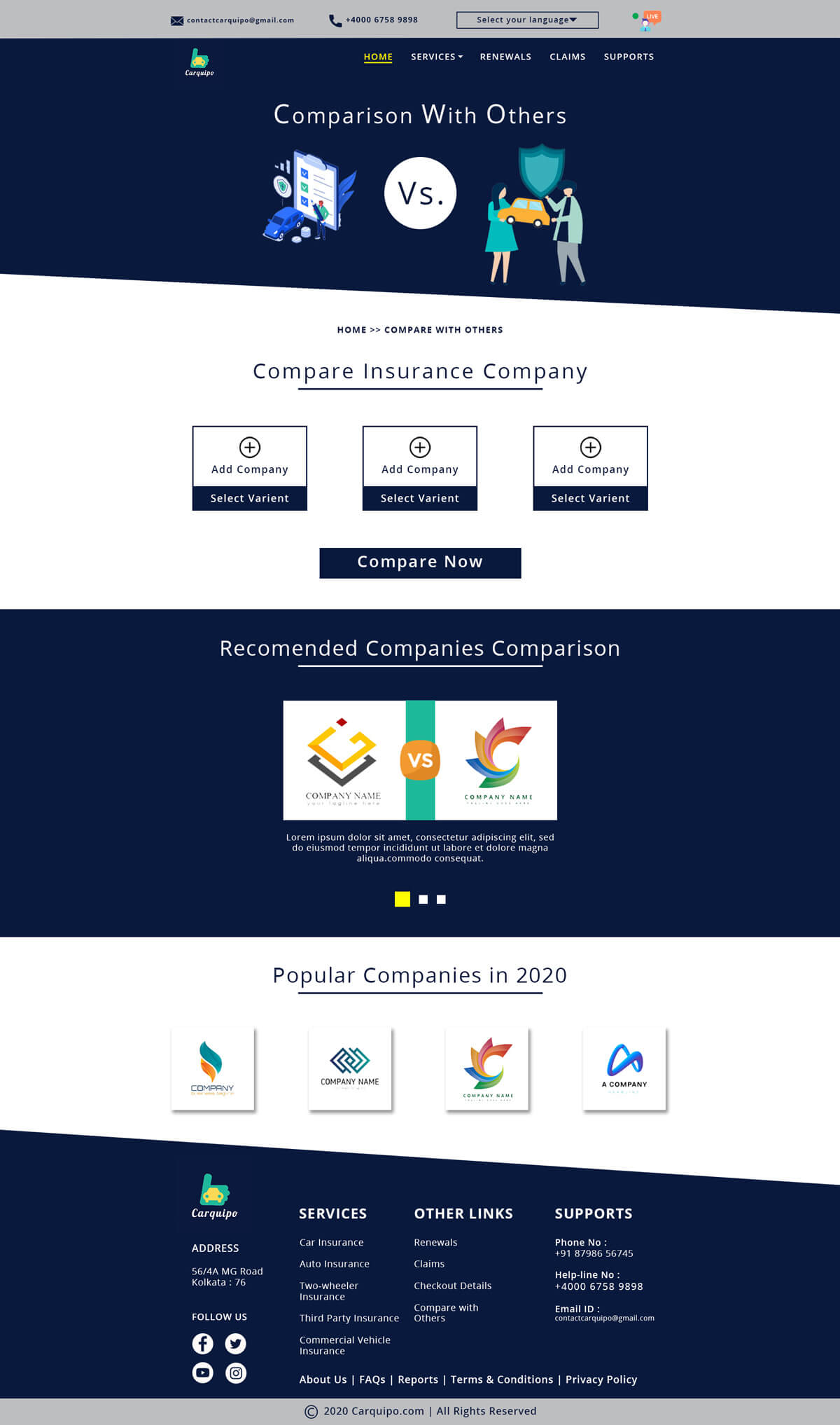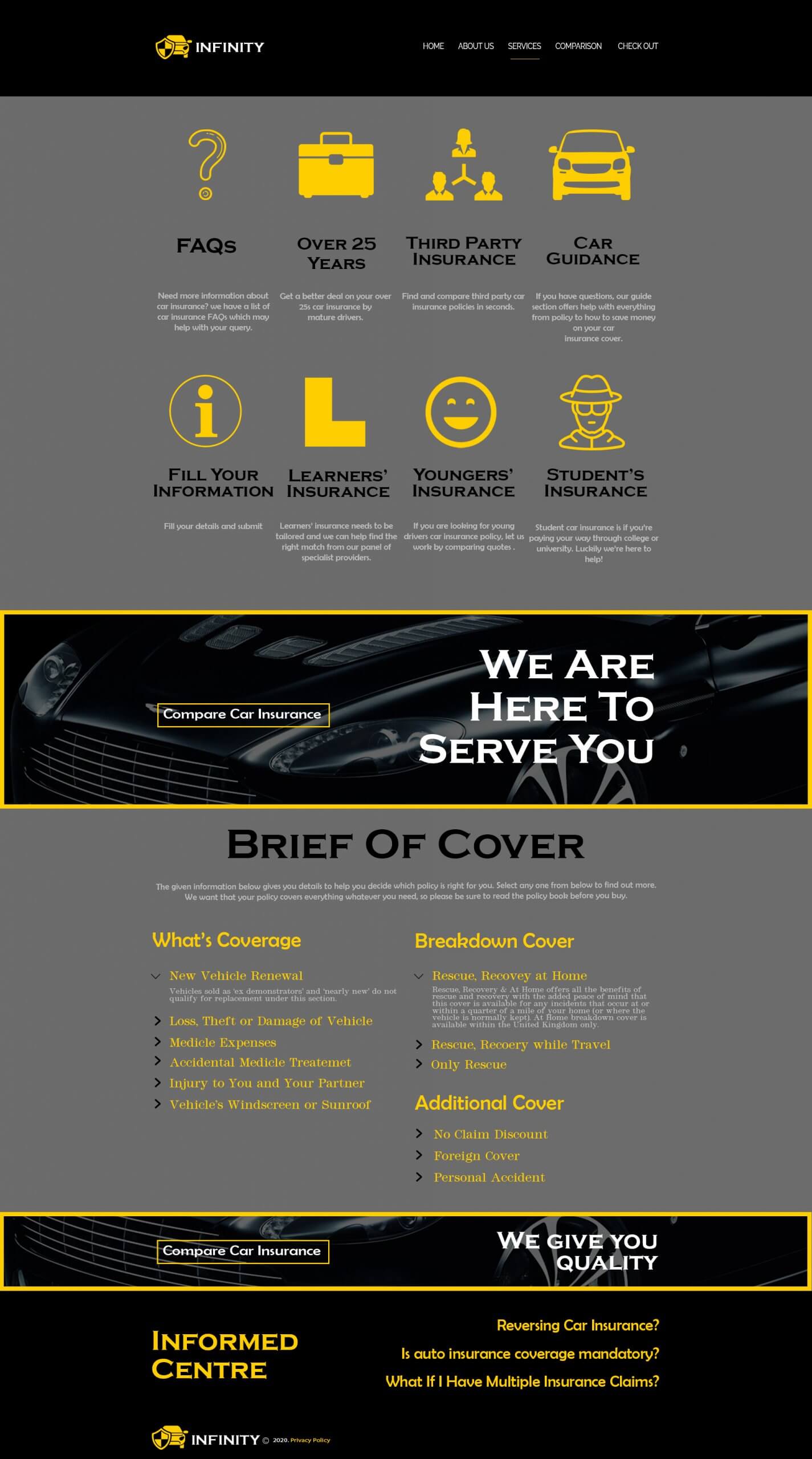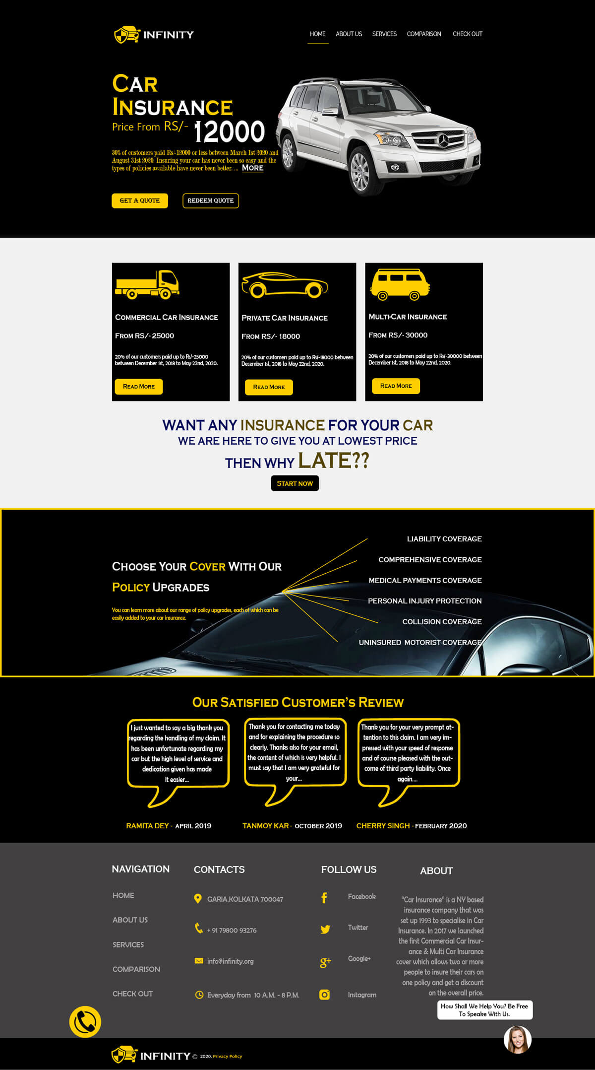 Create a mockup for insurance company providing car insurance through online. Your mockup must include Home page, Services page, Comparison with other insurance companies page, Check out page. Separately include an online chat option for the viewers/ visitors