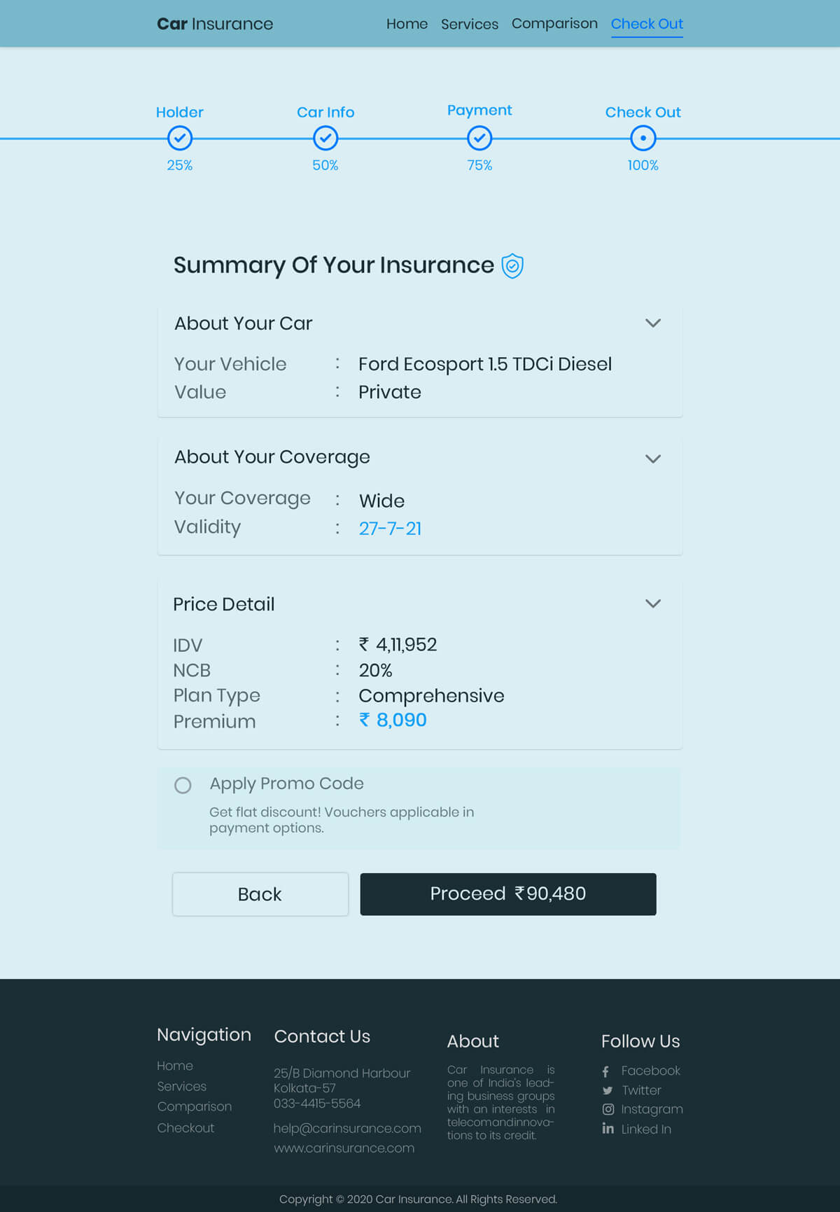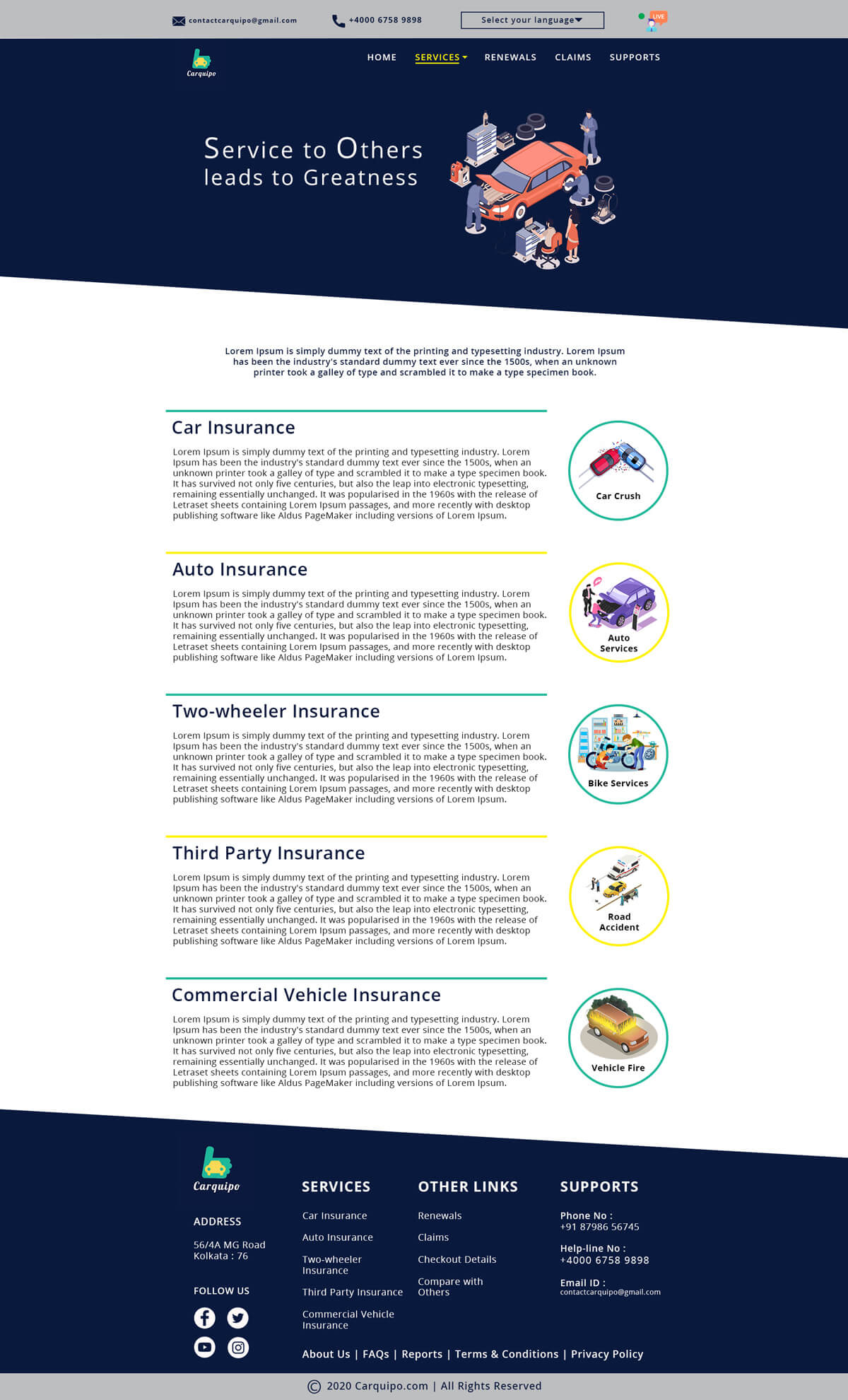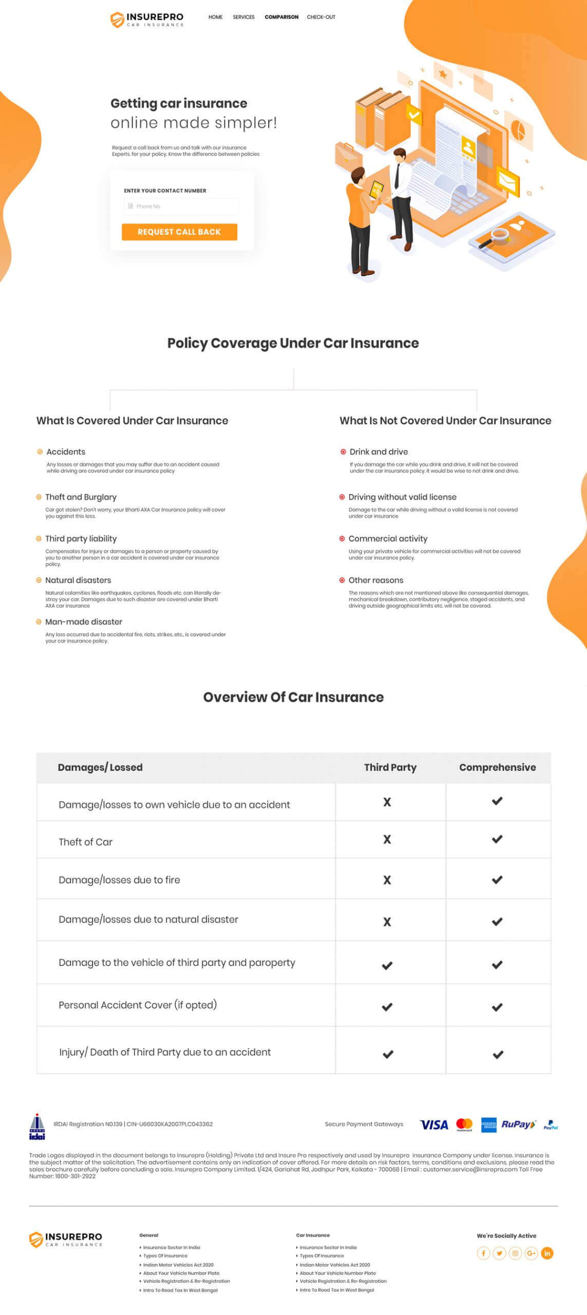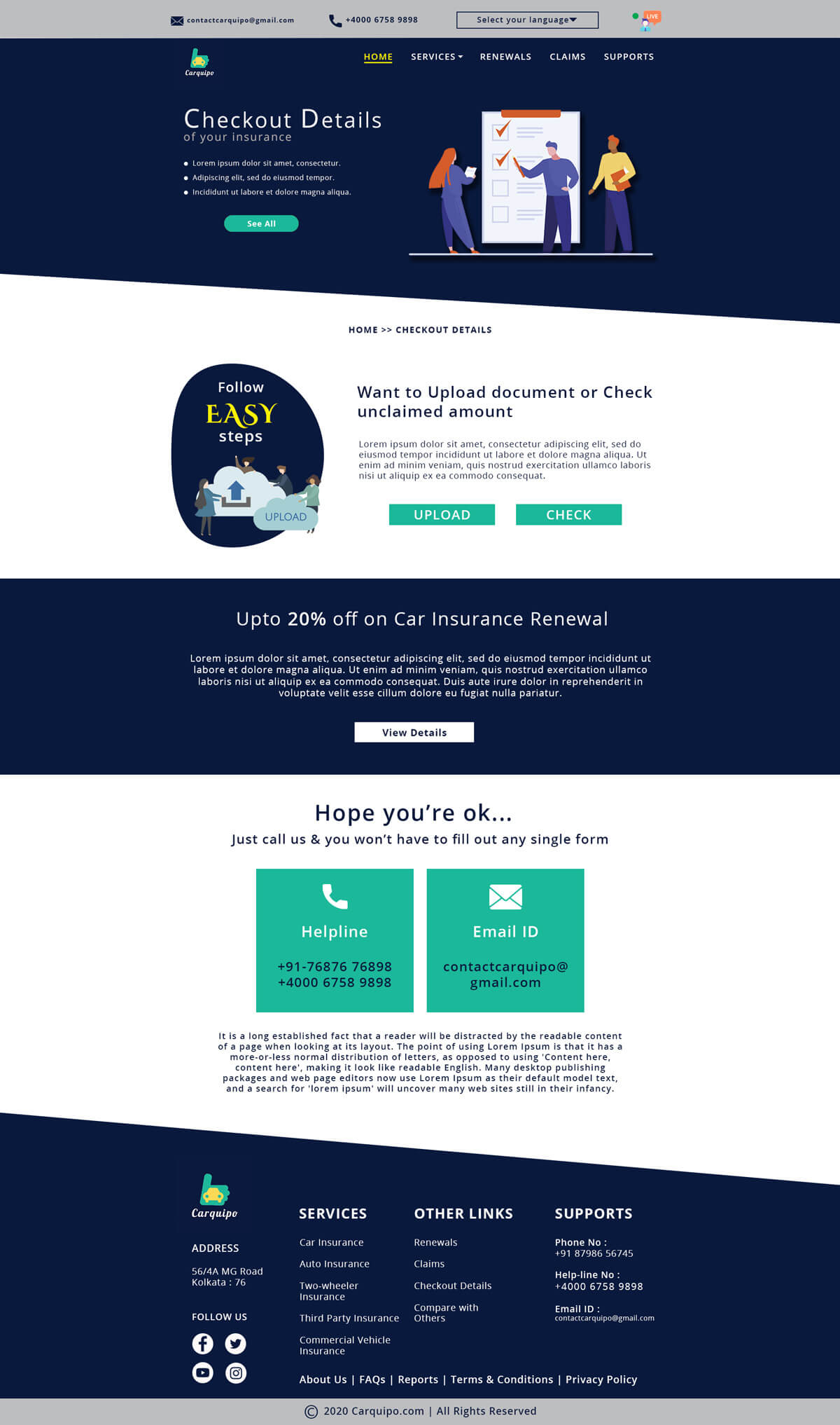 Create a mockup for insurance company providing car insurance through online. Your mockup must include Home page, Services page, Comparison with other insurance companies page, Check out page. Separately include an online chat option for the viewers/ visitors